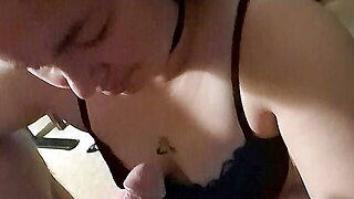 She sucks balls and cock until she gets a tasty finish and takes the semen with her slutty lips, big natural tits